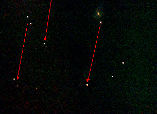 I downloaded a digital sky survey image of this area to check if this image really contains the NGC3729 galaxy. It appears that it is so, but at same time I discovered four ghost stars from my image. These, and where they came from, are indicated in the other image with arrows. This kind of ghost images are generated in stacking process when some of the frames are not aligned properly. Now I have to do the stacking process again taking care of proper alignment.