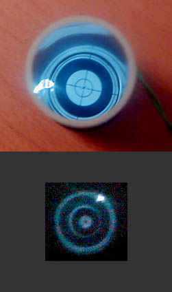 At lower right is a photo of the view when collimating the scope. When the inner black ring does not touch the outer black ring, collimation is ok. The outer black ring is on the inside of the black cap and the inner one is the center dot on telescopes main mirror. I had to add one on the mirror since my 150mm f5 GSO did not have one. When viewed by an eye this image appears very clear and sharp unlike on this photo.