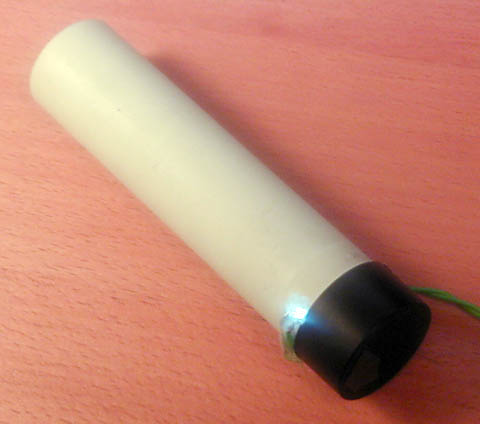 Self-made collimation tool. This is a kind of Cheshire tube but with internal illumination by a white LED. The black cap has a tiny hole drilled on the center. The lenght of the tube is selected to match my telescope so that the secondary mirror can also be collimated.