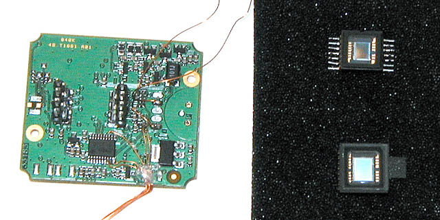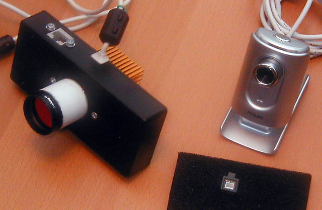 At bottom right; Sony ICX424AL monochrome CCD-chip waiting to be installed on the Toucam Pro above. This chip has larger pixel size than the standard ICX098BQ chip used on Toucam Pro and has no color filters (bayer mask) on chip, so it should be 5..6 times more sensitive than the original. However, to get color pictures one needs to make multiple exposures with external color filters. These two will become a 'SC3'-modified webcam some day, for planets and guiding.