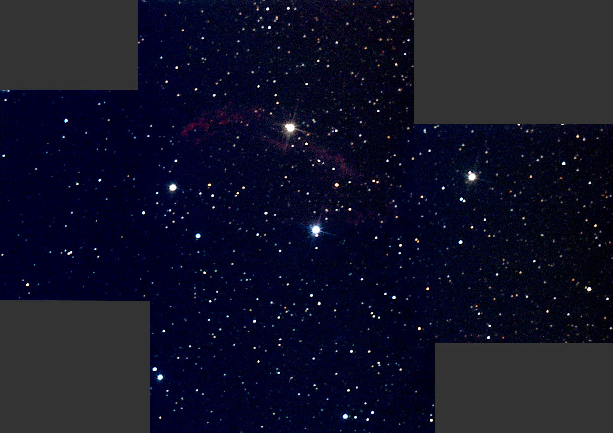 80 x 15s on each of the 4 (out of 684 total), dark frame and synthetic flat fieldsProcessing: Stacked in K3CCDTools. Adjusted in Photoshop. Notes: Clearly the exposure time was too short to capture this nebula well. I also had problems building this mosaic since the partial pictures tended to have different background levels and faint details did suffer when trying to process the background even. The variations were caused by stray light entering the telescope tube, and as the RA axis turns slowly during and between exposures the amount varies. I think it can be remedied by using an additional stray-light shield in front of the telescope in future.