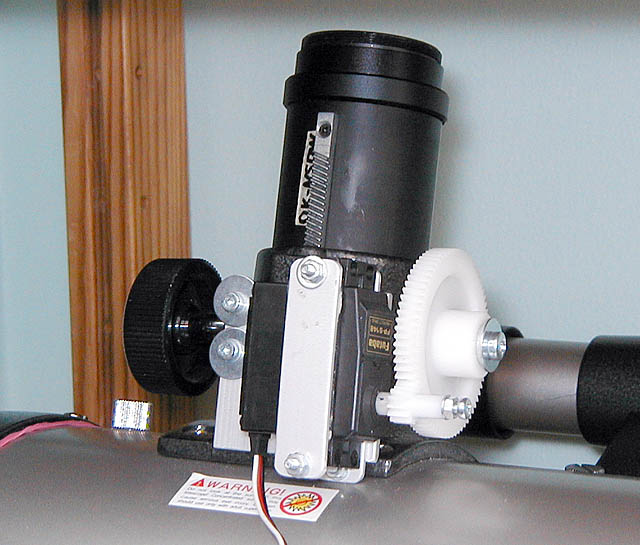 This is an electric focuser modification made from 2 gears and an old modified R/C servo. This can be powered by other modified R/C servo (turning othercauses the other to turn also) or by a separate hand-controller powered from 12V. Electric focuser makes focusing much easier, especially with CCDs, since it does not cause vibrations on optical system that would have to attenuate before focusing can be verified and then re-adjusted..